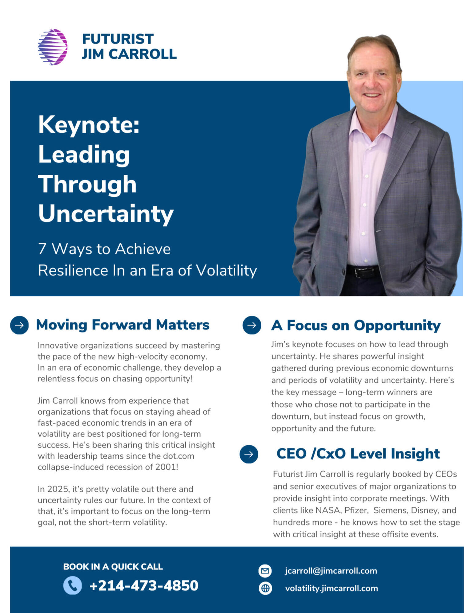 This keynote is more than just a presentation; it’s a call to action. Jim Carroll will inspire your audience to stop waiting for the “perfect moment” and instead, create their own momentum, find joy in the challenge, and lead their organizations to not only weather the current economic climate but to emerge stronger, faster, and ready to define what’s next.